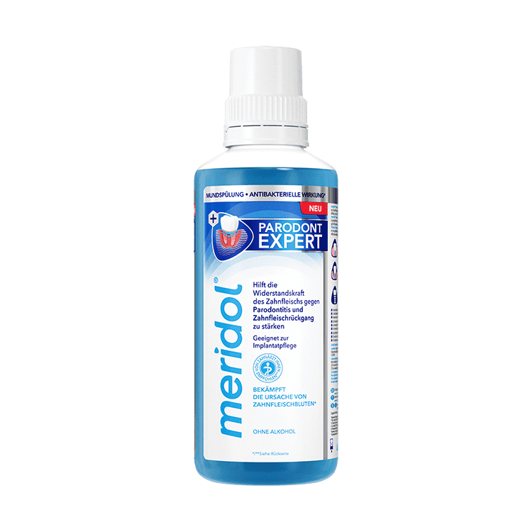 Pflegen Sie Ihr Zahnfleisch, Ihre Zähne und Ihre Implantate, wenn Sie mit der meridol Parodont Expert Mundspülung spülen. Diese Mundspülung bekämpft nicht nur die Ursache von Zahnfleischbluten und Entzündungen*, sondern hilft auch, die Widerstandskraft Ihres Zahnfleisches gegen Blutungen, Parodontitis und Rückbildung zu stärken. Die Mundspülung bekämpft gezielt Plaquebakterien, die oft die Ursache* für das Problem sind. Die Zahnfleisch-Mundspülung wurde mit einer wirksamen, pflegenden Formel entwickelt und ist sowohl für natürliche Zähne als auch für Implantate klinisch erprobt.